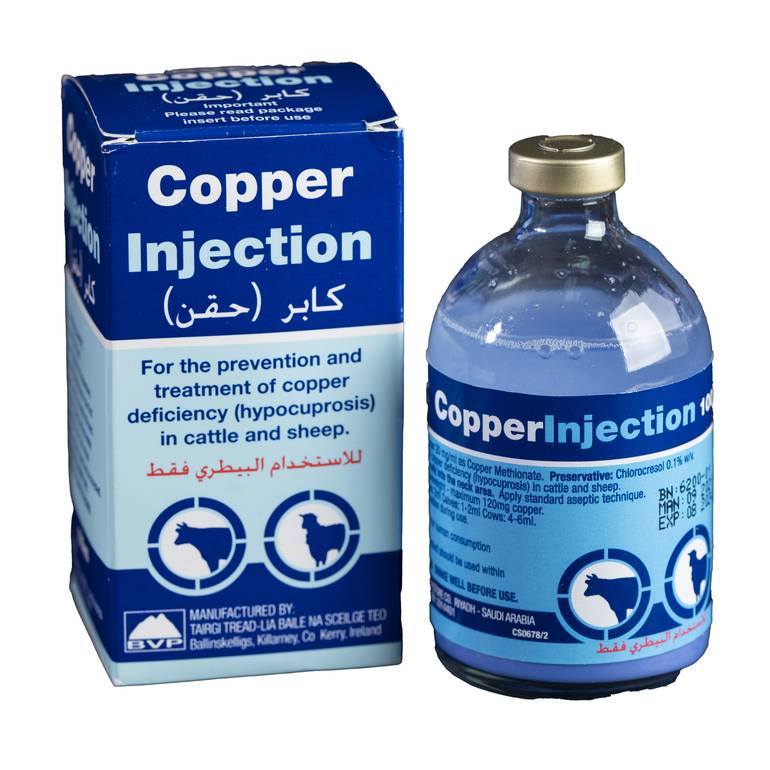 معلق للحقن. يحتوي كل مل على 20 مجم نحاس على هيئة ميثيونيت نحاس و 1 مجم كلوروكرزول كمادة حافظة. الجرعات وطريقة التناول: عن طريق الحقن العضلي العميق. الأبقار: 4-6 مل العجول: 1-2 مل الحملان: 0.5 مل إيويز : 2 مفلترة السحب: الحليب: لا يوجد اللحم: 21 يوم لا يجوز التخزين فوق 25 درجة مئوية. احمي من الضوء. تجنب درجات الحرارة القصوى. بعد سحب الجرعة الأولى ، استخدم القارورة في غضون 28 يومًا. لا ينبغي إعادة تدوير الحاويات المستعملة تخلص من الأجزاء المستعملة والأوعية الفارغة في نفايات المزرعة. لعلاج الحيوانات فقط. يحفظ بعيدا عن متناول الأطفال. الوكيل الوحيد شركة مخزن الصفا الرياض – المملكة العربية السعودية